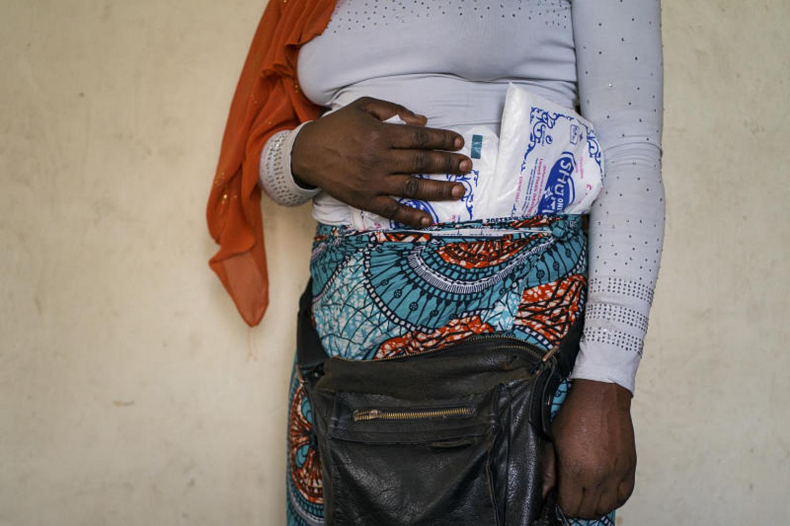 A Rwandan smuggler hiding plastic bags in her clothing while preparing to smuggle it across the border, in the city of Goma in the neighbouring Democratic Republic of Congo.