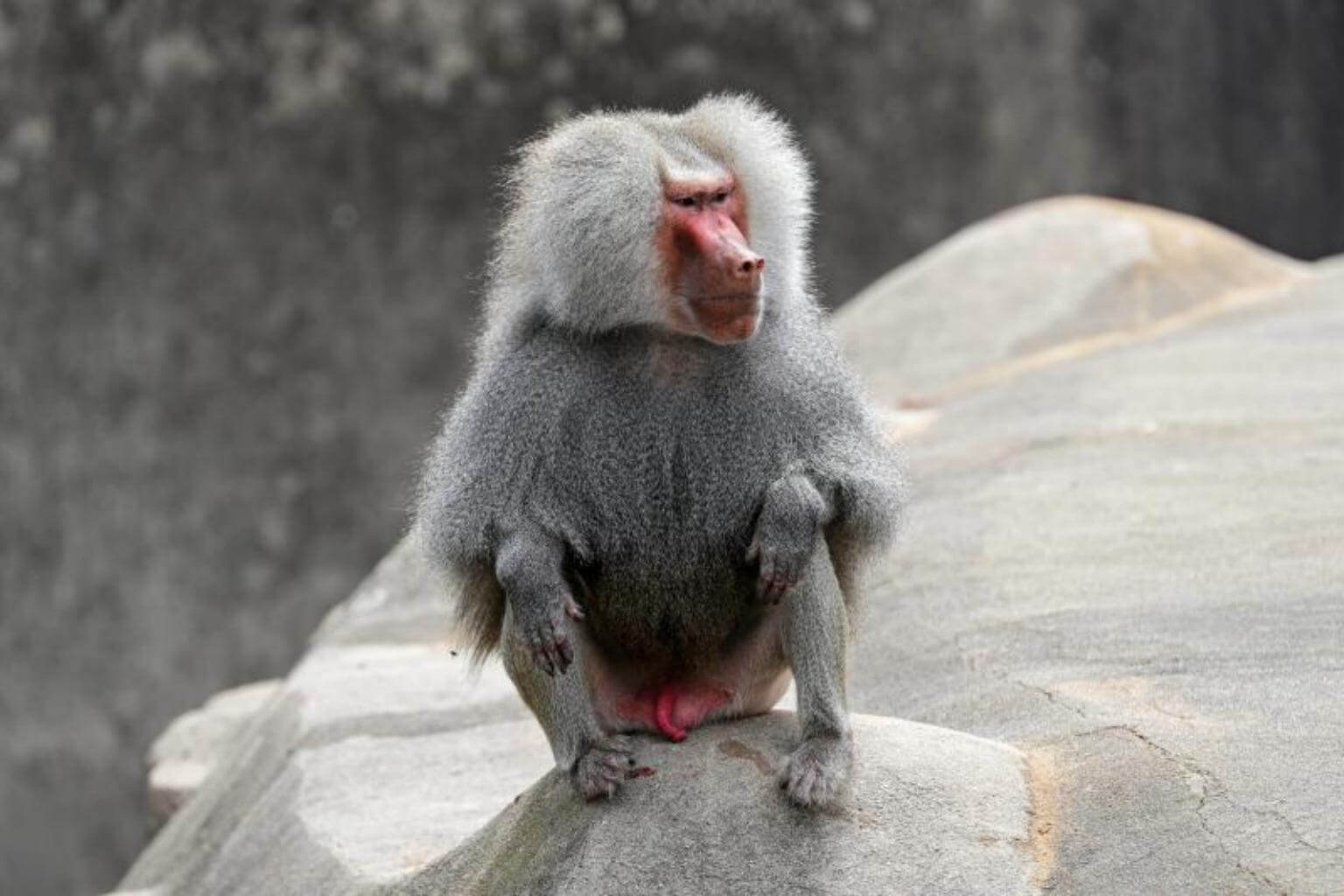 A Hamadryas baboon looks on in its enclosure at the zoo in Frankfurt Main, Germany, on July 17, 2017.