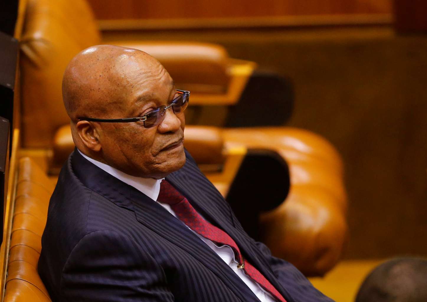 President Jacob Zuma looks on as members of Julius Malema's Economic Freedom Fighters (EFF) party raise objections before being evicted from Parliament, in South Africa, on May 17, 2016.