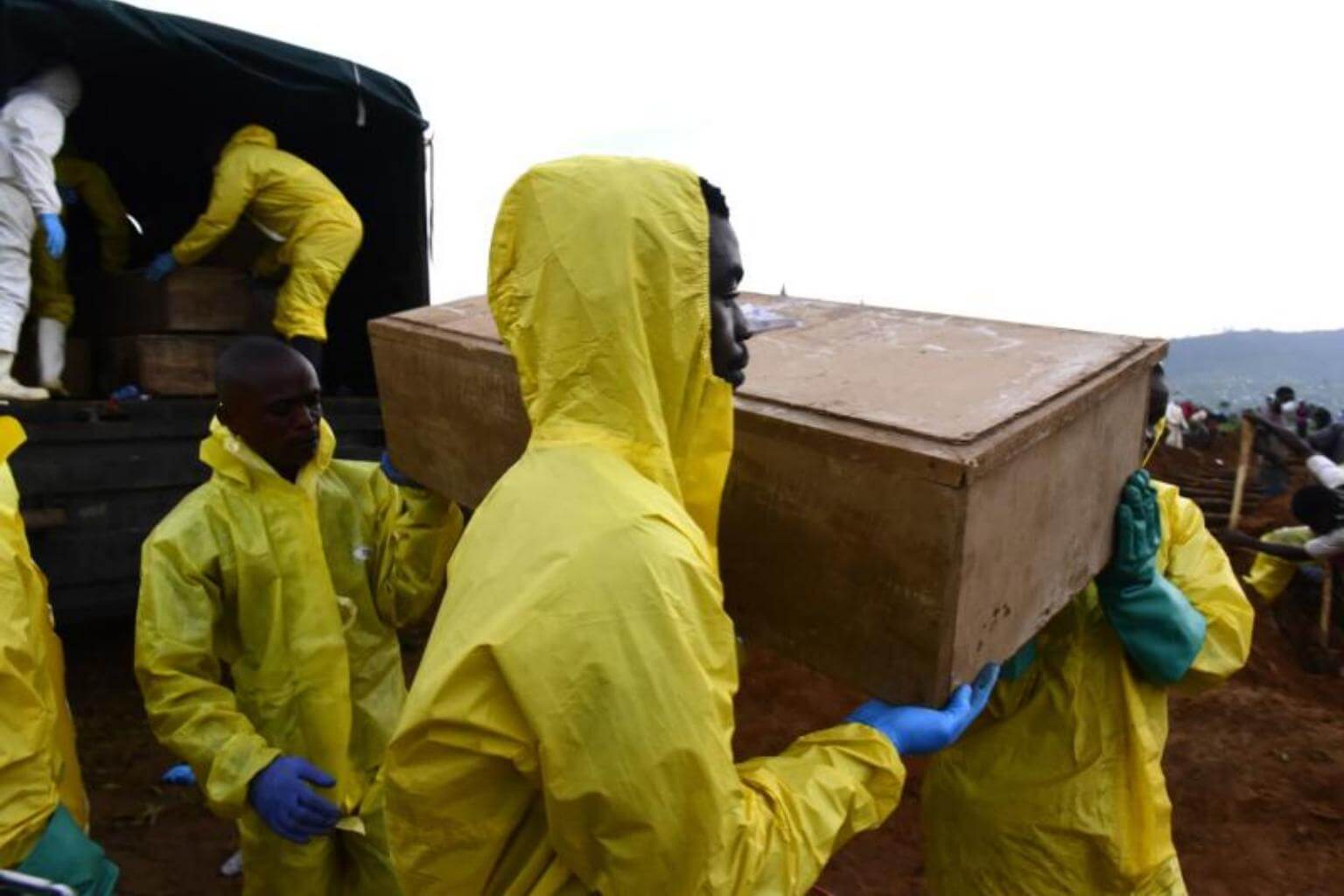 Men carry coffins of mudslide victims at the Waterloo cemetery near Freetown, Sierra Leone on Aug 17, 2017.