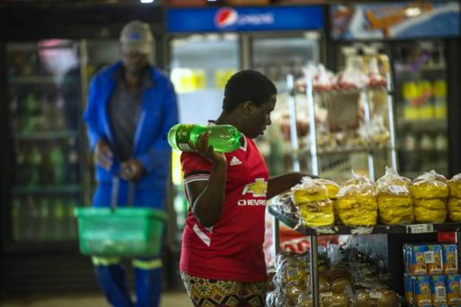 A woman holding a bottle of soft drink as she shops around at a local supermarket in the Township of Zandspruit, Greater Johannesburg, South Africa.
