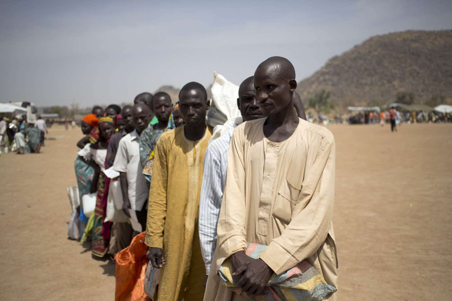 Nigerian refugees lining up to receive food aid at the Minawao refugee camp in Northern Cameroon in a photo released by UNICEF, on April 5, 2016.