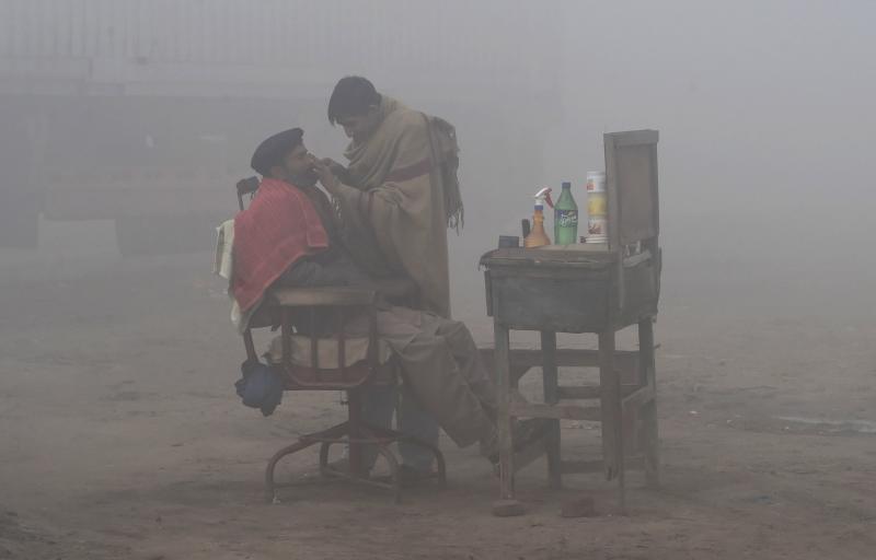 A Pakistani barber shaves a customer alongside a road amid heavy fog and smog conditions in Lahore on January 24, 2019. Deadly smog-incuding emissions are one of the problems driving a worldwide epidemic that hampers the global economy, said the United Nations.