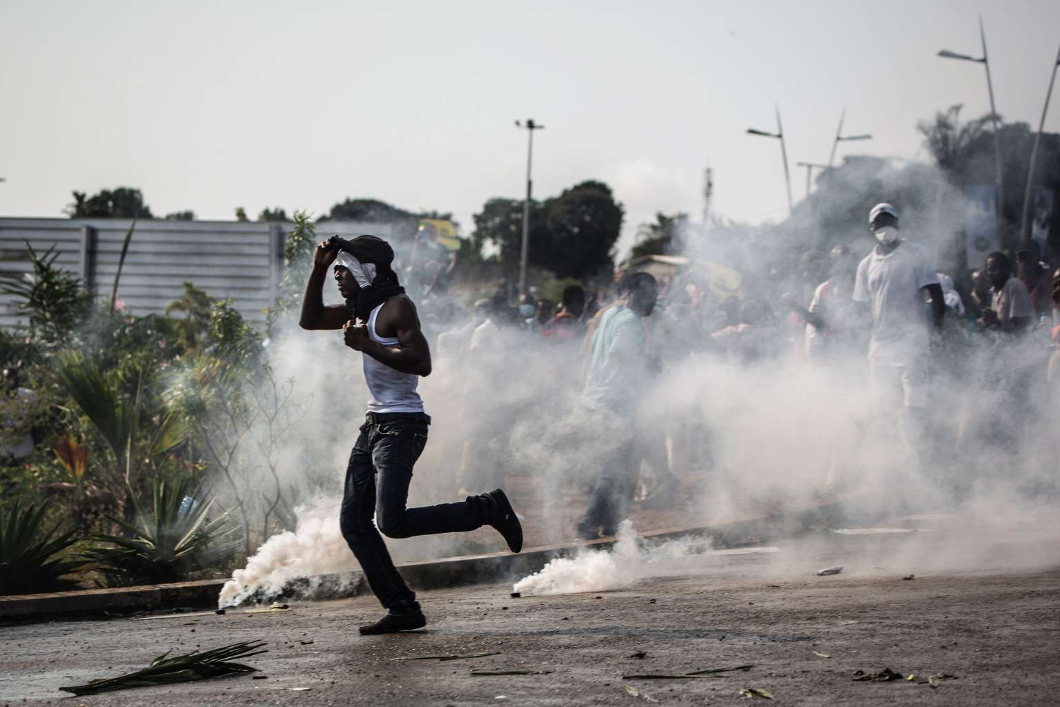 A protester runs amid tear gas canisters during confrontations with the police in Libreville on Aug 31, 2016.
