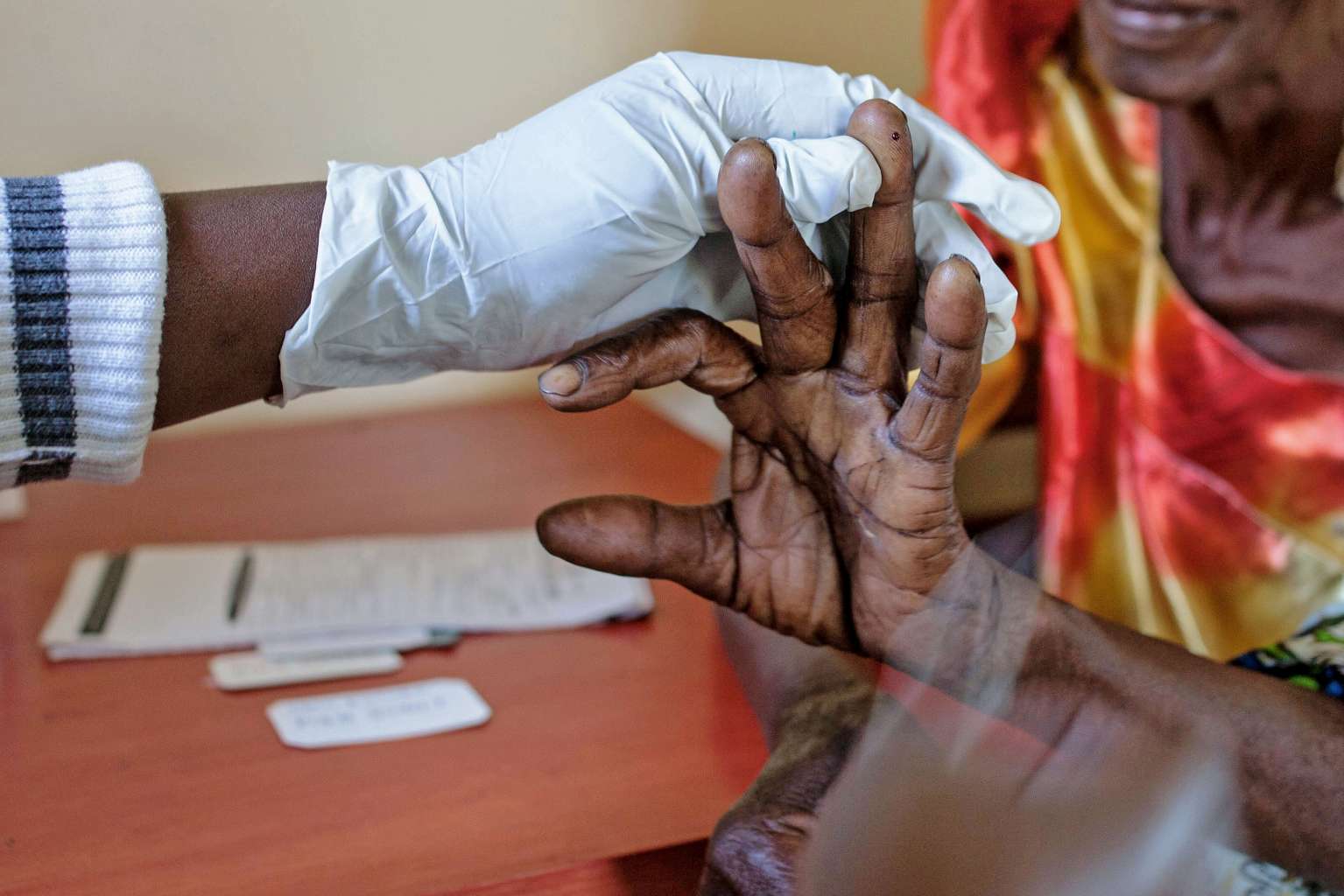 An elderly woman gets tested for Malaria at a health centre in eastern Uganda, on April 7, 2017.