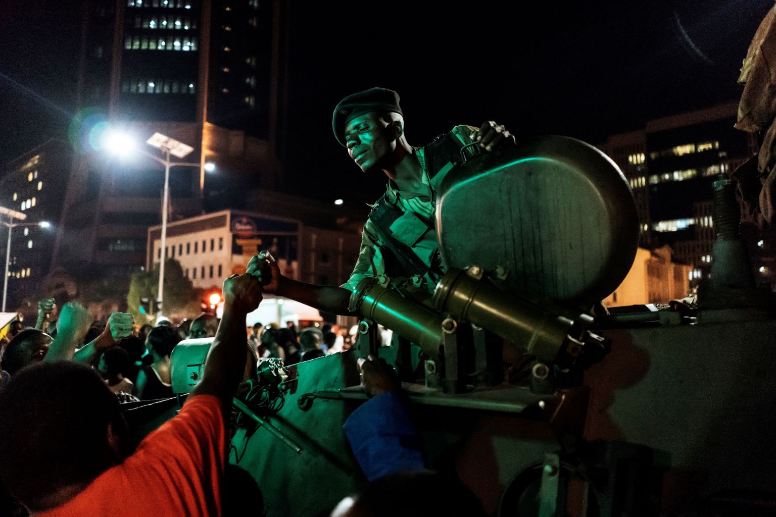 A Zimbabwean soldier sitting in tank gestures as people greet and celebrate after the resignation of President Mugabe.