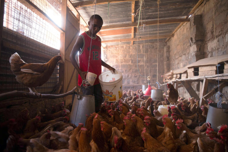 Kenyan farmer Victor Kyalo feeds his chickens food from an organics recycling company.
