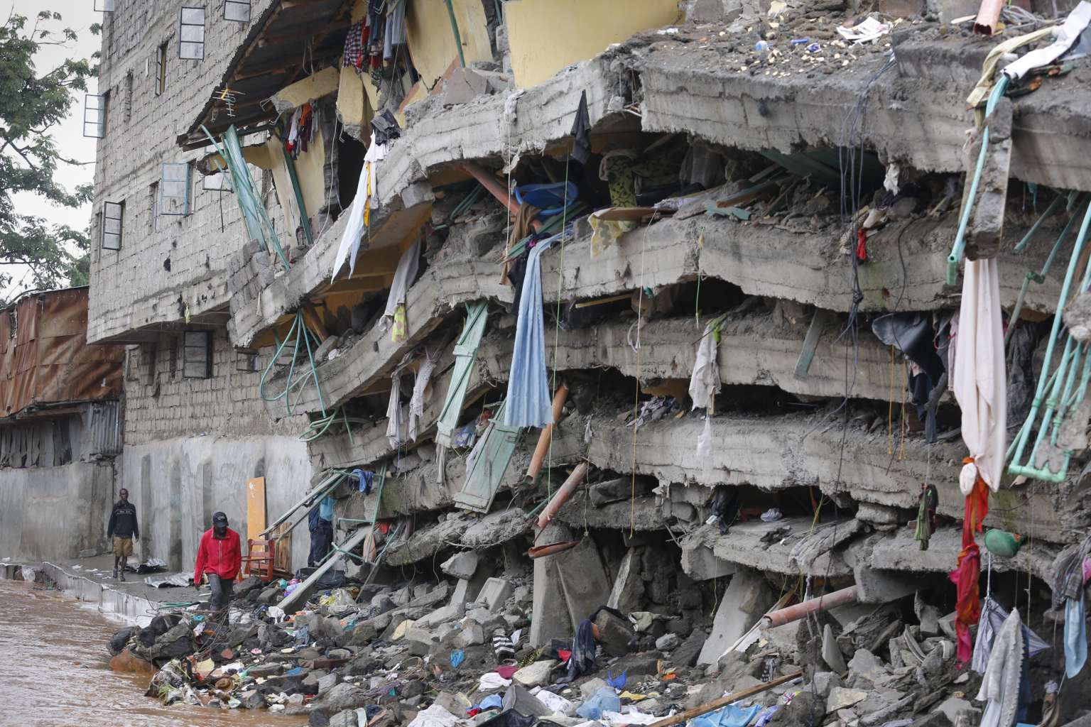 Local residents walk next to a collapsed building in the Huruma estate of Mathare slum, Nairobi, Kenya on May 1, 2016.