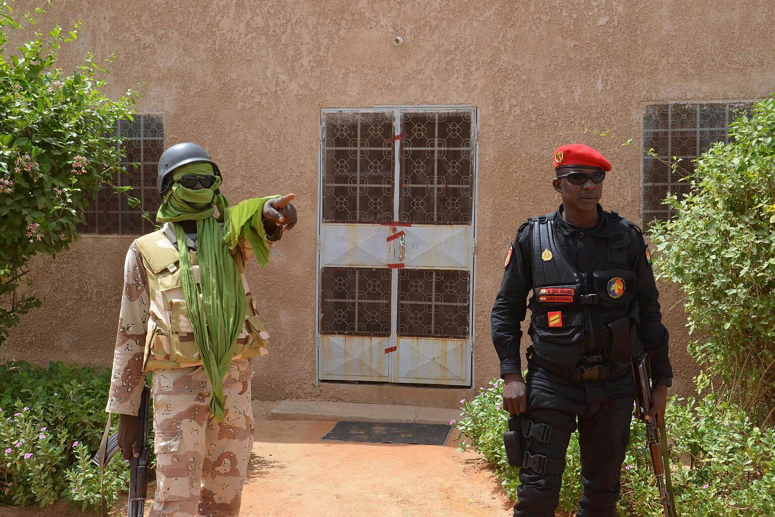 Two members of Niger's security forces standing guard outside the home of an US aid worker, Jeffery Woodke, who was kidnapped on Oct 14 by armed men in Abalak.