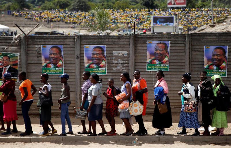 People queue to enter an election rally of Zimbabwean President Emmerson Mnangagwa's ruling ZANU PF party in Mutare on May 19, 2018.