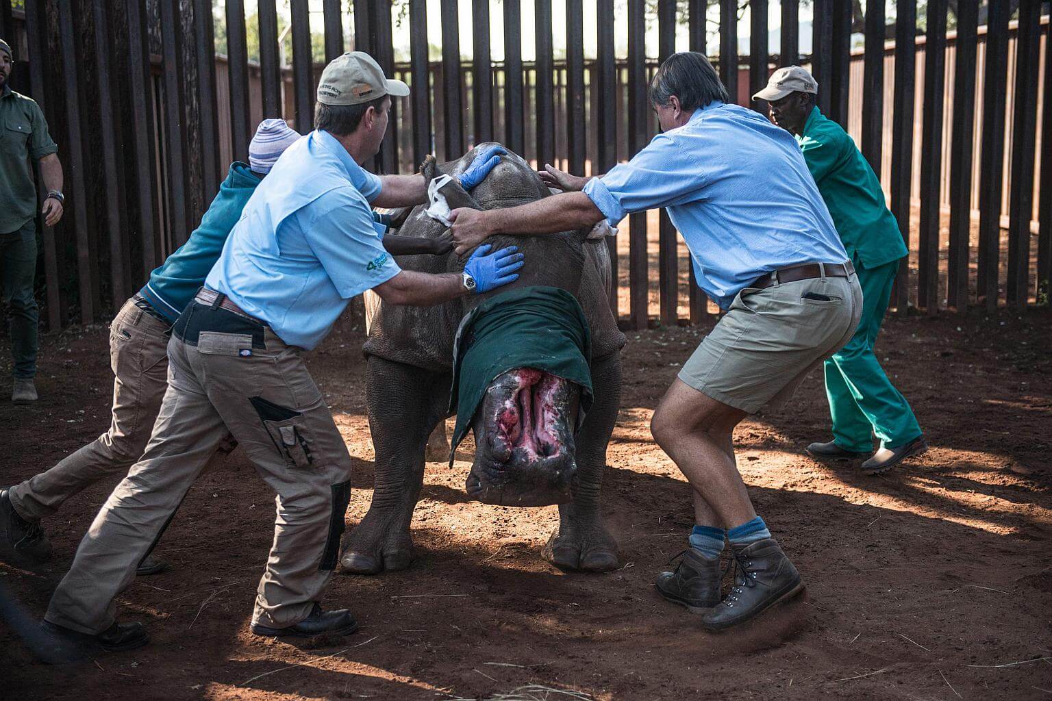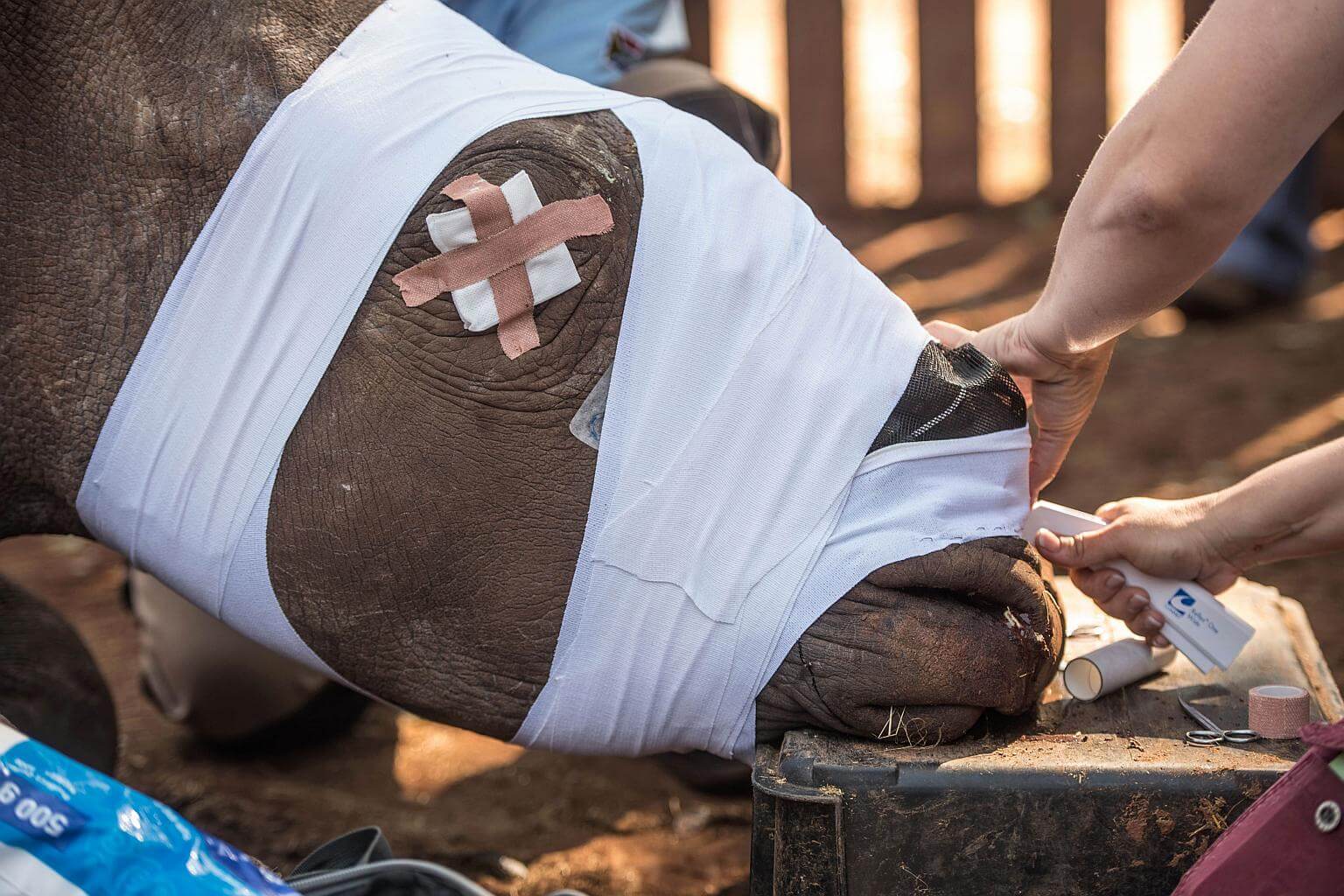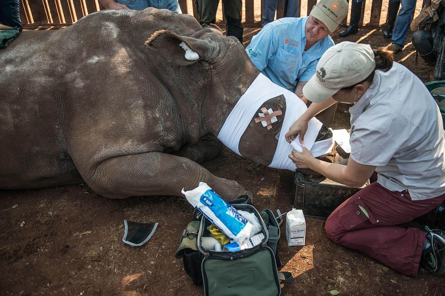 Within seconds the rhino hops to her feet, and the surgeons back off quickly, crossing their fingers that the latest dressing will stay in place.