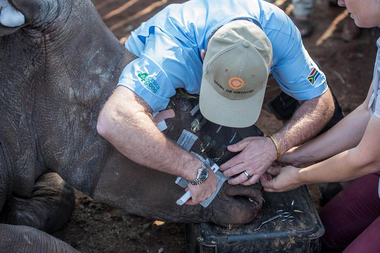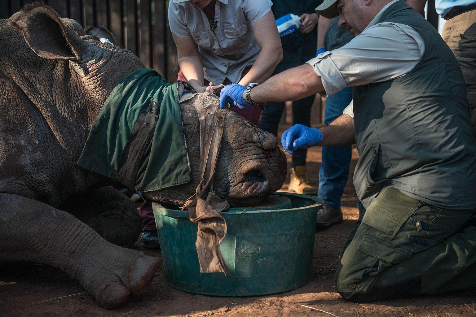 South African veterinarians applying bandage and stitches to the poached de-horned rhinoceros.