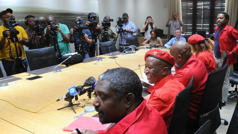 Opposition party leader Julius Malema (second from left) addresses a media conference in response to the resignation of President Jacob Zuma at the Houses of Parliament, Cape Town, on Feb 15, 2018.