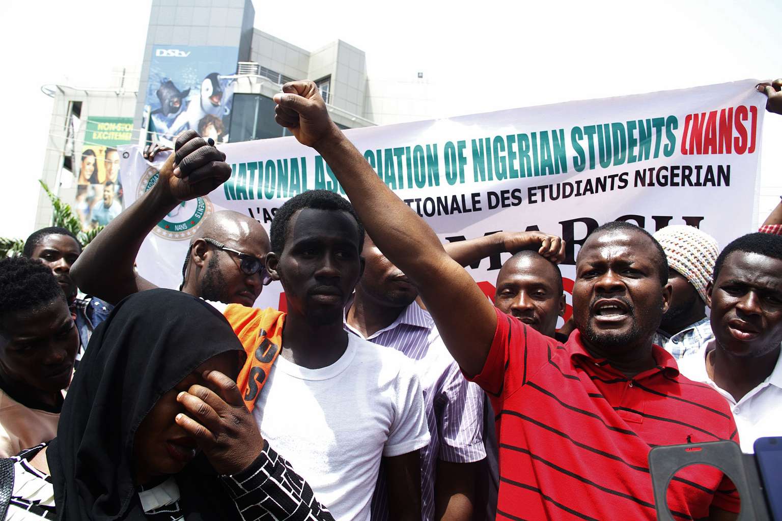 Nigerian students shout slogans against South Africa as they protest outside the South African Digital Satellite TV's Nigerian headquarters in Abuja against the recent spike in attacks targeting foreign nationals in South Africa on Feb 23, 2017.