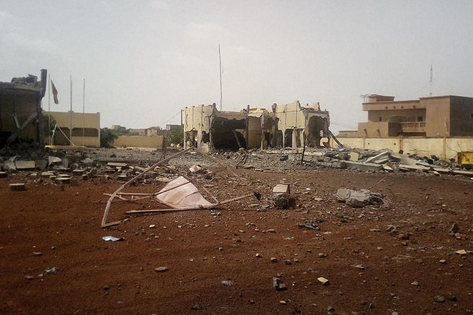 Debris scattered in front of the Malian headquarters of an international anti-terror task force, G5 Sahel, following an attack by a suicide bomber, on June 29, 2018.