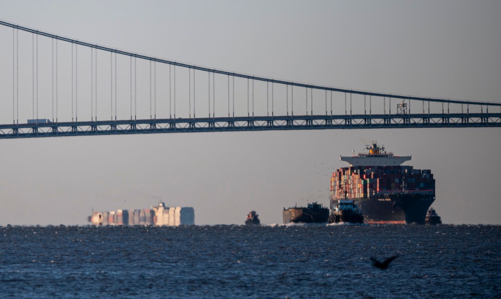 A container ship makes its way to the Port of New York and New Jersey under the Verrazano Bridge in April 2020.