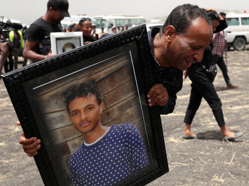 A relative carries a portrait of Ethiopian Airlines pilot Yared Getachew as he mourns at the scene of the Ethiopian Airlines Flight ET 302 plane crash, near the town Bishoftu, Ethiopia on March 14, 2019.
