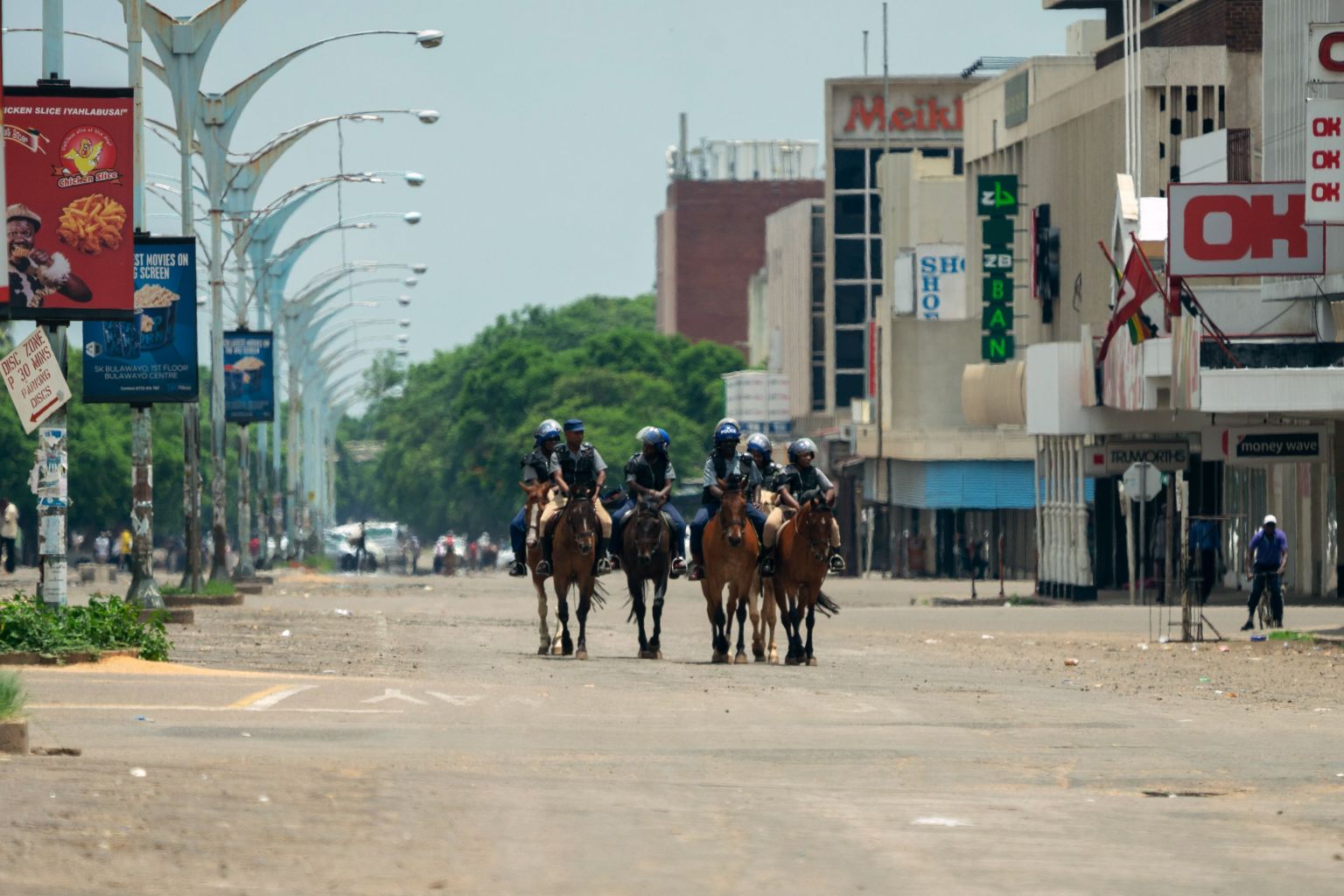 Mounted police on patrol following violent protests in the country triggered by a sharp, sudden rise in fuel prices in Bulawayo, Zimbabwe, on Jan 16, 2019.