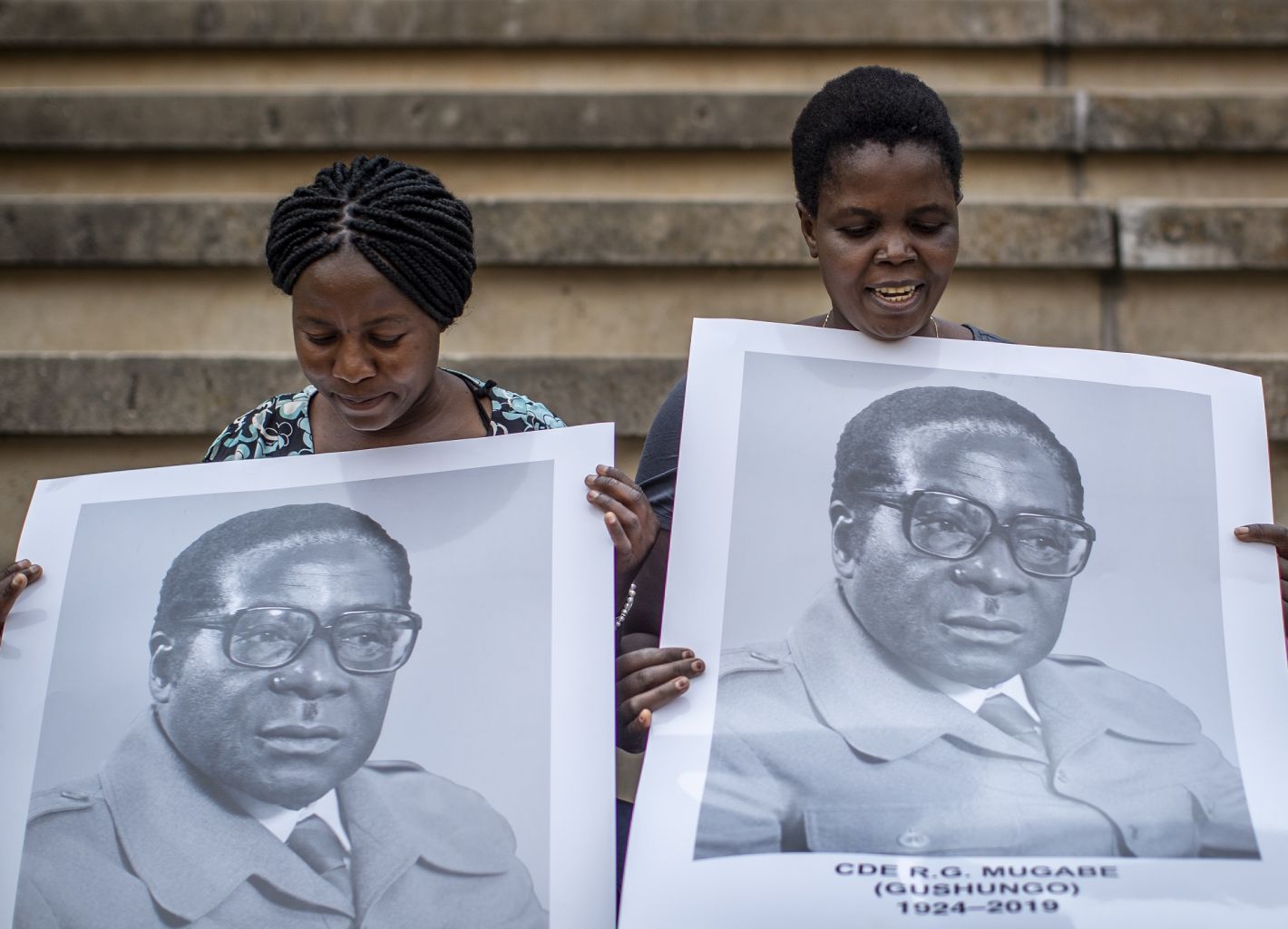 Women in the stands hold posters of former president Robert Mugabe at his state funeral in Harare.