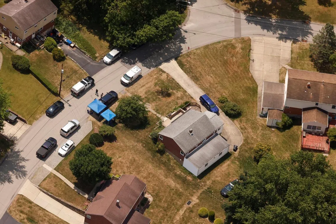 An aerial view showing law enforcers at the home of Thomas Matthew Crooks, named as the “subject involved” in the attempted assassination of former president Donald Trump.
