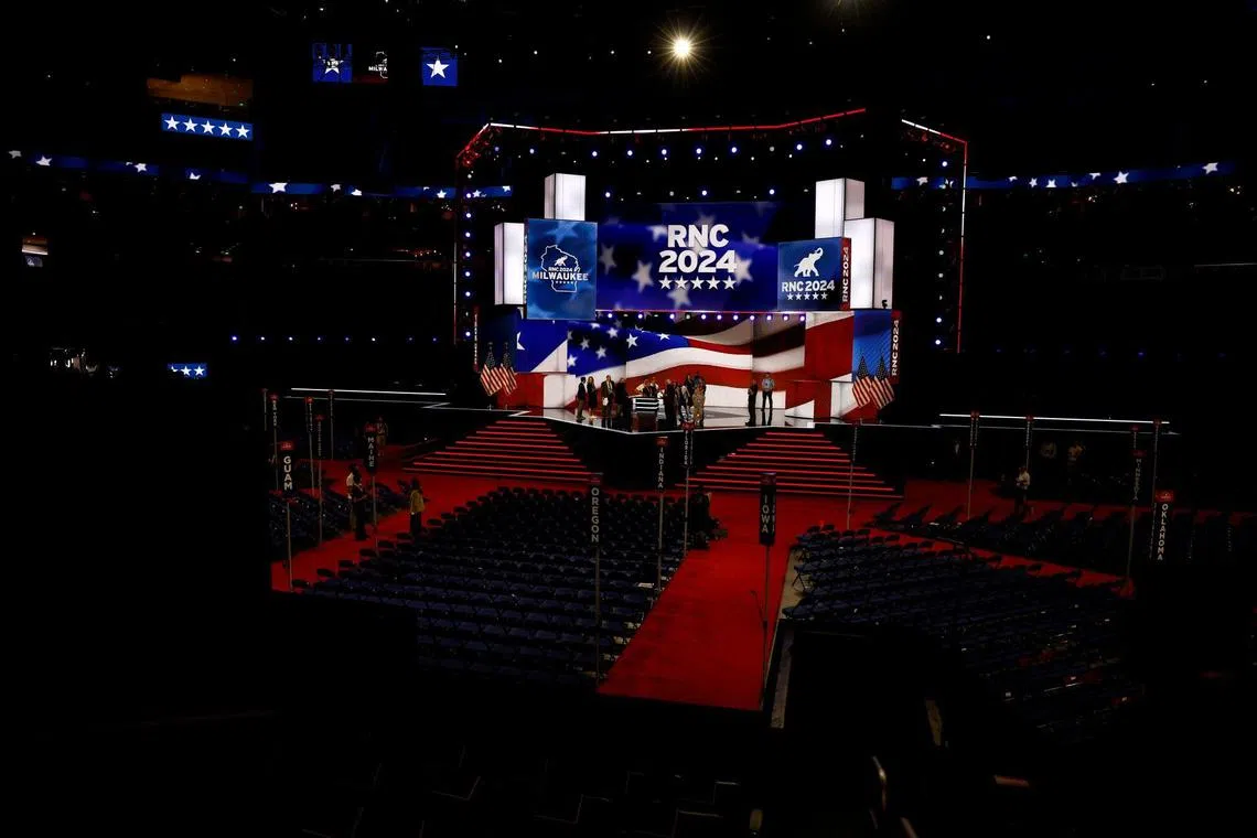 The stage being prepared inside the Fiserv Forum ahead of the Republican National Convention in Milwaukee on July 14.