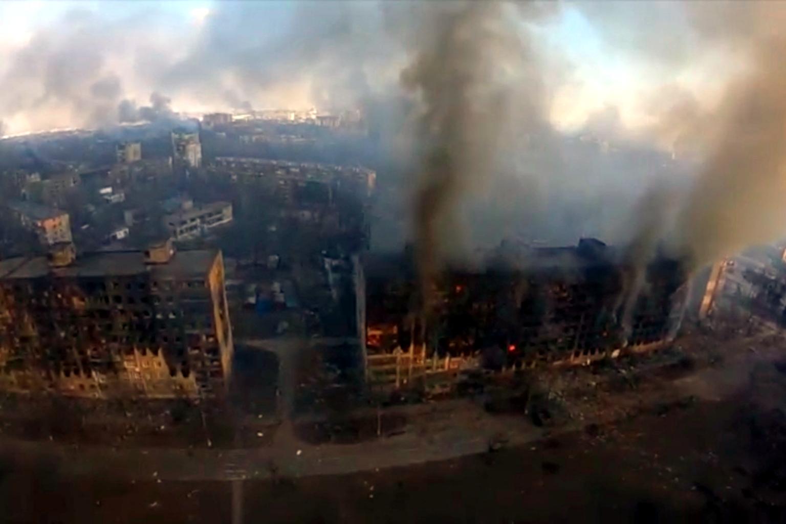 An aerial view shows smoke rising from damaged residential buildings following an explosion in Mariupol on March 14, 2022.