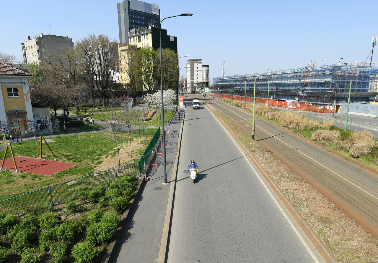A person wearing a protective face mask travels on a moped in Milan, Italy, on March 21, 2020.