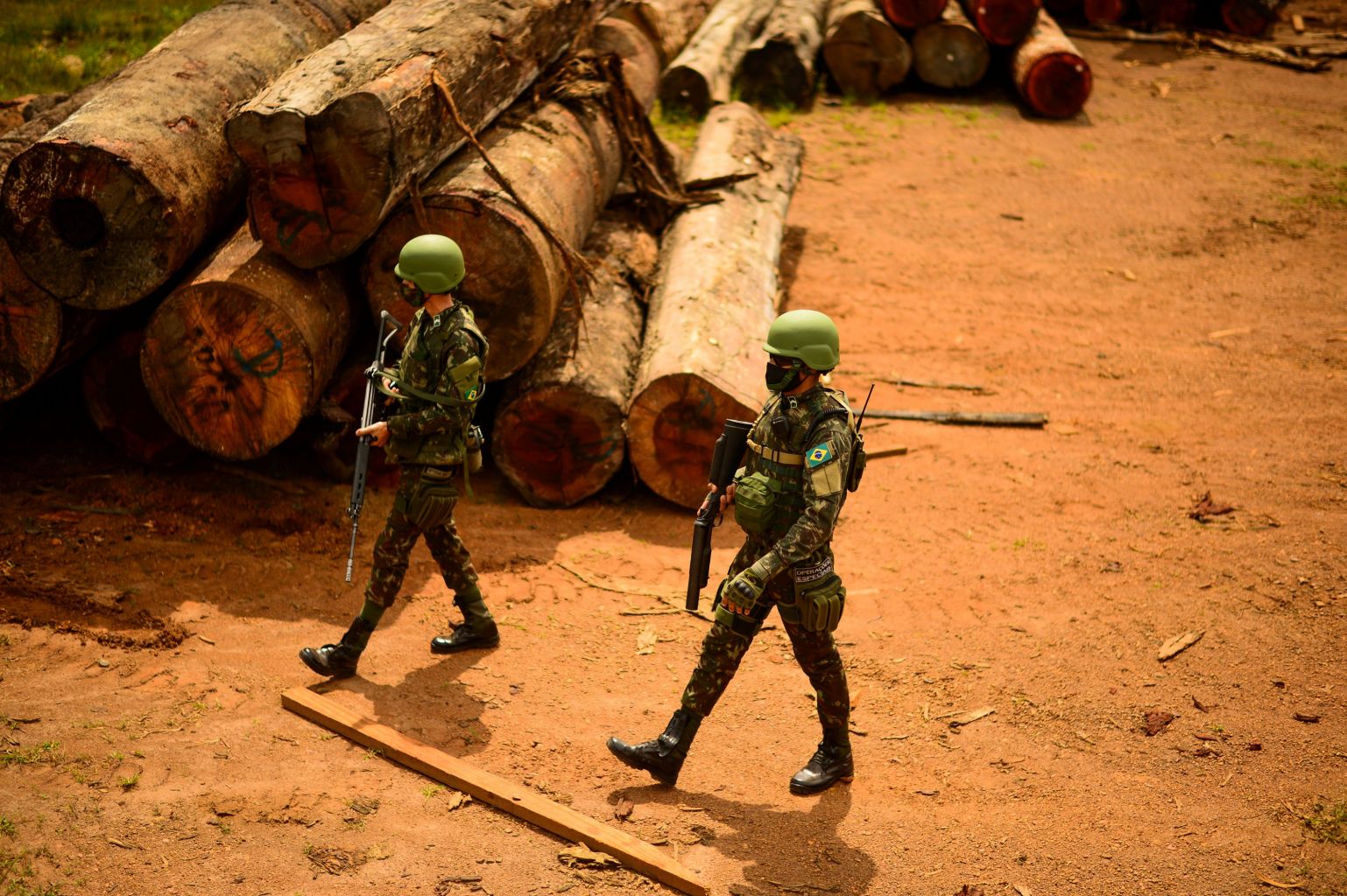 A May 2020 photo shows Brazilian army soldiers walking next to piles of lumber cut illegally from the Amazon rainforest during an operation in Porto Velho, Rondonia state.