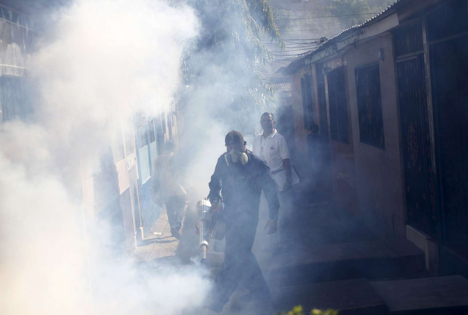 A municipal health worker fumigating a neighborhood as part of the city's effort to prevent the spread of the Zika virus, in Tegucigalpa, Honduras, on Jan 26, 2016.