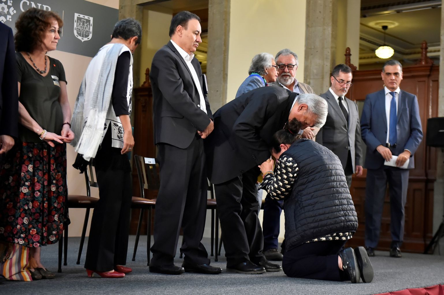 Mexico's President Andres Manuel Lopez Obrador comforts a woman who knelt down to ask him for help to look for her missing relative, during an event in June 2019 in which Mexico's government identified thousands of human remains accumulated in morgues and mass graves during a decade of gang violence.