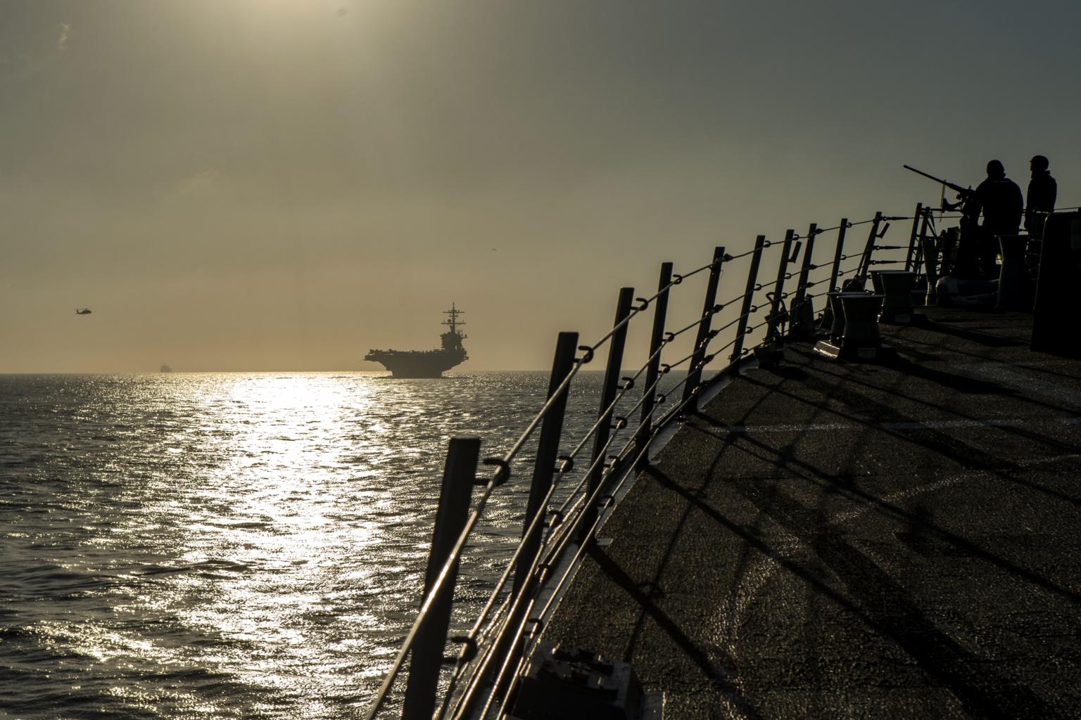 The guided-missile destroyer Bainbridge follows the aircraft carrier Abraham Lincoln into the Strait of Gibraltar, on April 13, 2019. The USS Abraham Lincoln Carrier Strike Group is being deployed to the Middle East to send a clear warning to Iran.