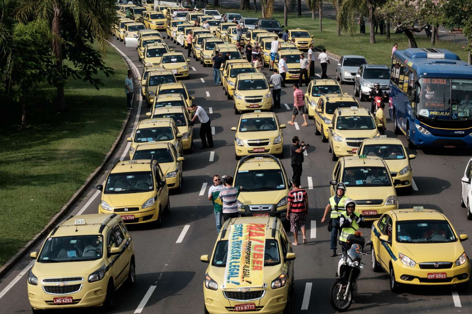 Protesting taxi drivers block an avenue in Rio de Janeiro, Brazil, on April 1, 2016.