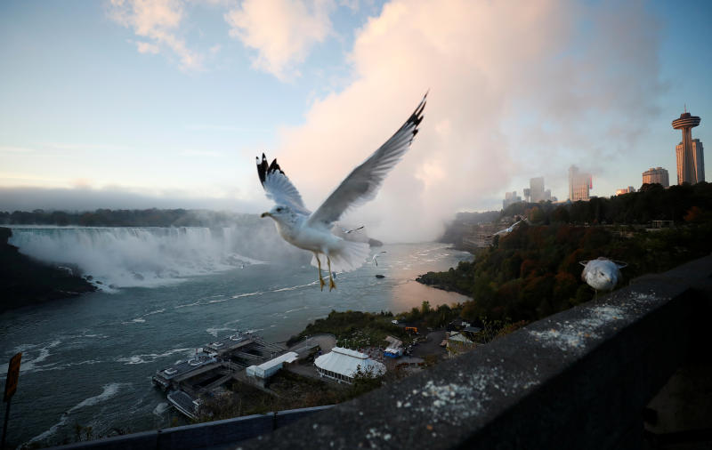 A seagull flies over the Niagara Falls in Ontario, Canada, on Oct 19, 2019.