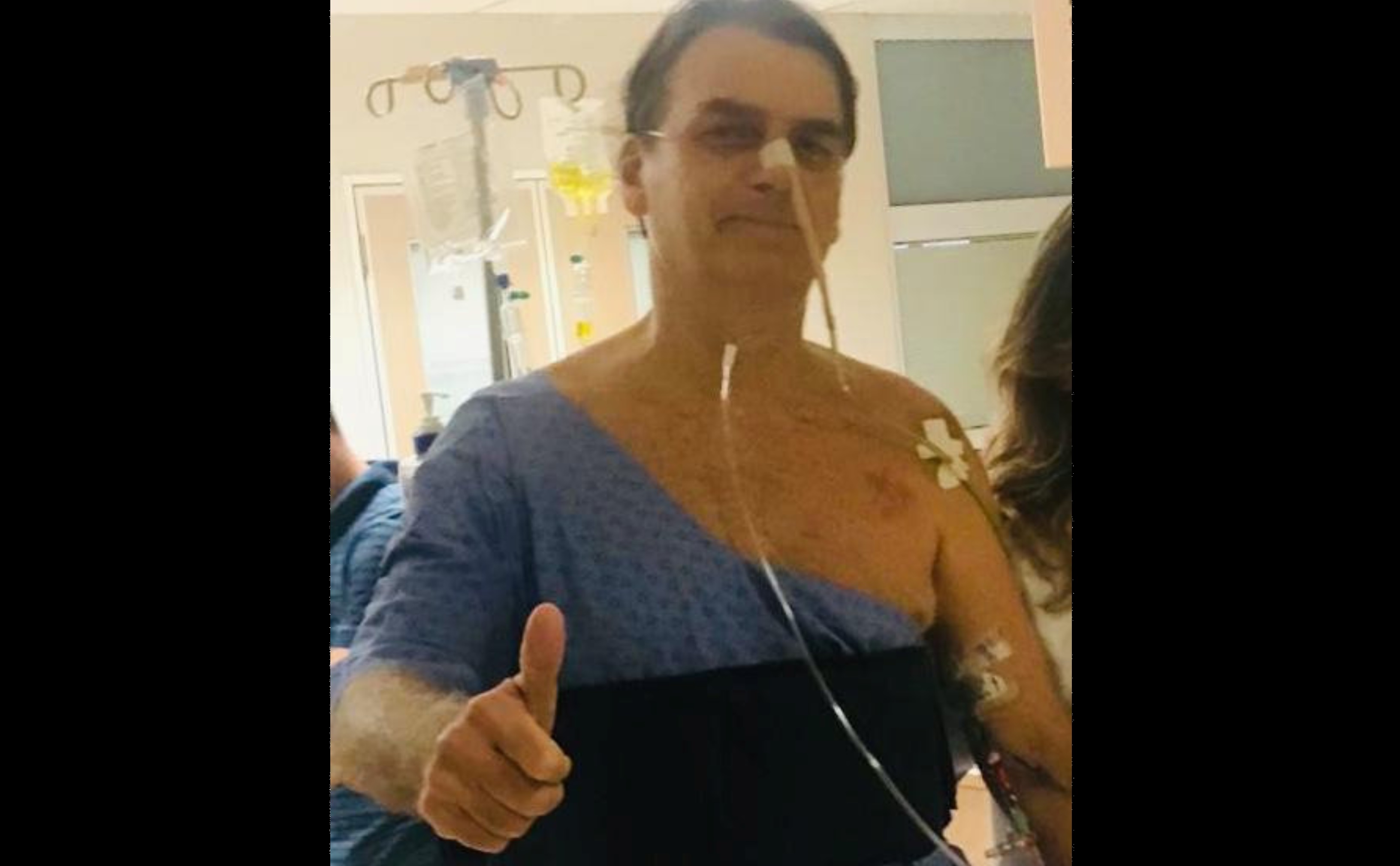 Brazil's President Jair Bolsonaro thumbs up as he is hospitalised at Albert Einstein Hospital in Sao Paulo, Brazil, February 7, 2019.