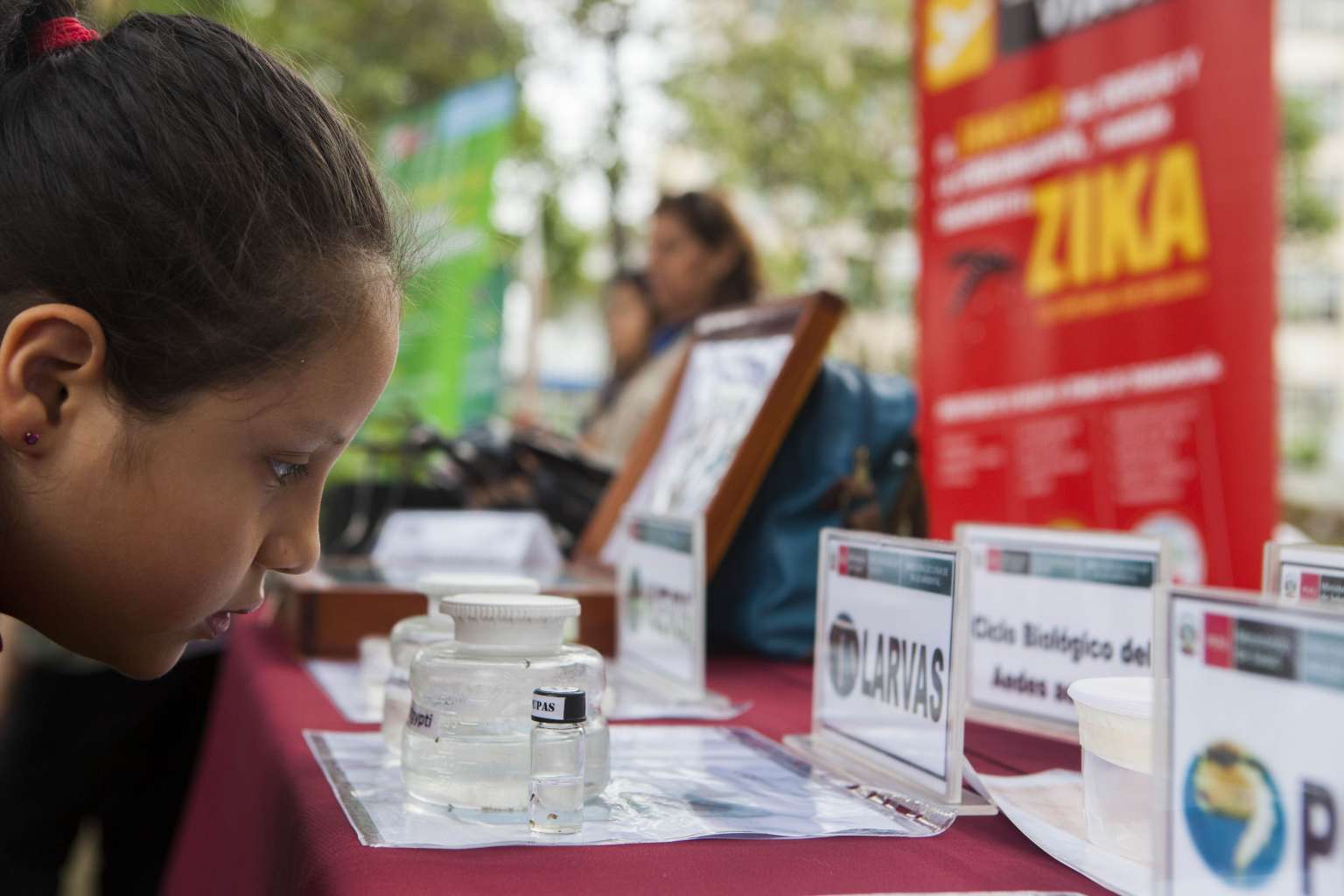 A child looks at information on the mosquitos that transmit Zika in Lima, Peru, on Jan 27, 2016.