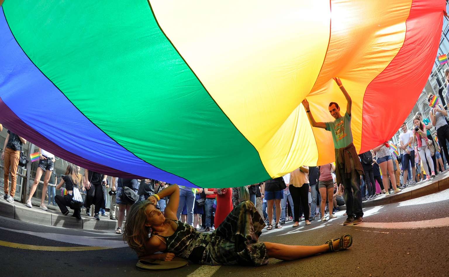 A woman lies on the ground under a huge rainbow flag during the Gay Pride parade in Belgrade on Sept 18, 2016.