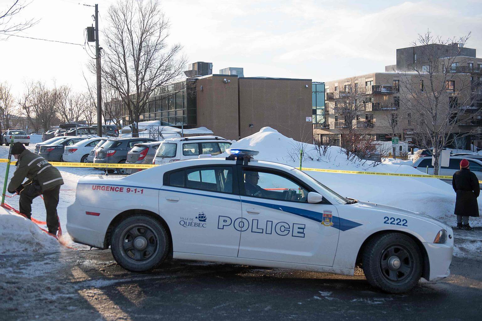 In Quebec City, police cars were stationed in front of various mosques, with officers checking the identification of reporters waiting outside.