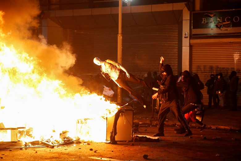 A demonstrator tosses a mannequin into a improvised bonfire during a protest against the government in Valparaiso, Chile, on Oct 19, 2019.