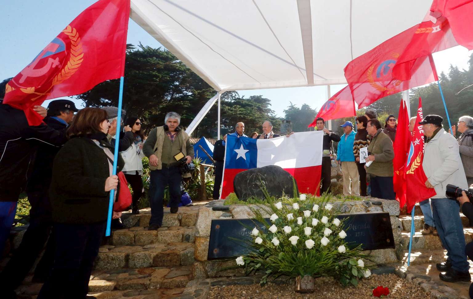 A small group of Communist party activists watched from a distance, breaking into chants honoring "comrade Pablo Neruda." He was laid to rest alongside his late wife and muse, well-known soprano Matilde Urrutia.