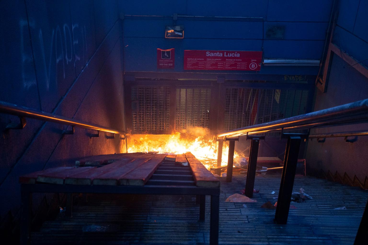 A fire set by protesters burns at an entrance to Santa Lucia metro station in Santiago, Chile, on Oct 18, 2019.