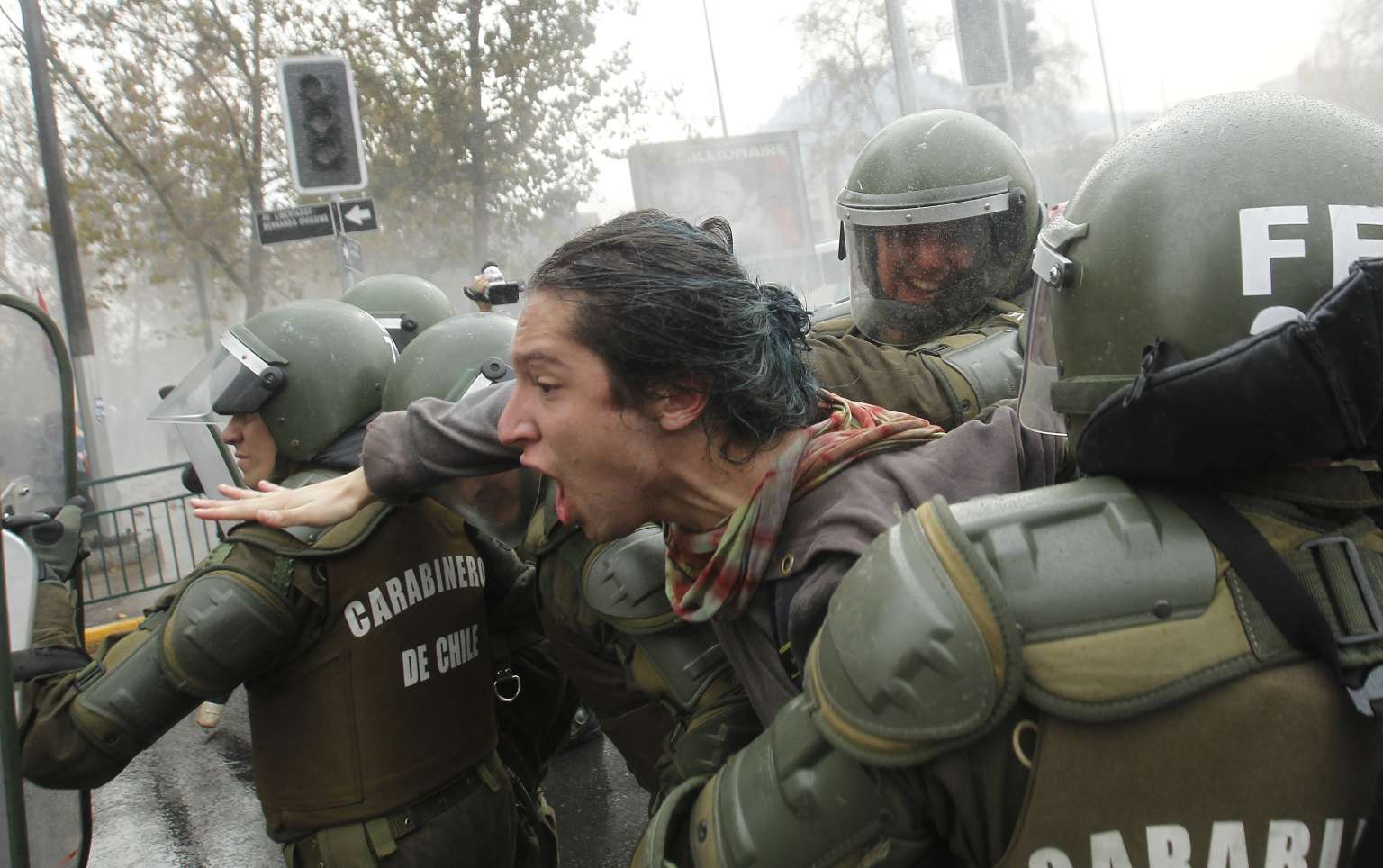 Riot police arrest a student during a march against the slow pace of educational reform, in Santiago, on May 26, 2016.