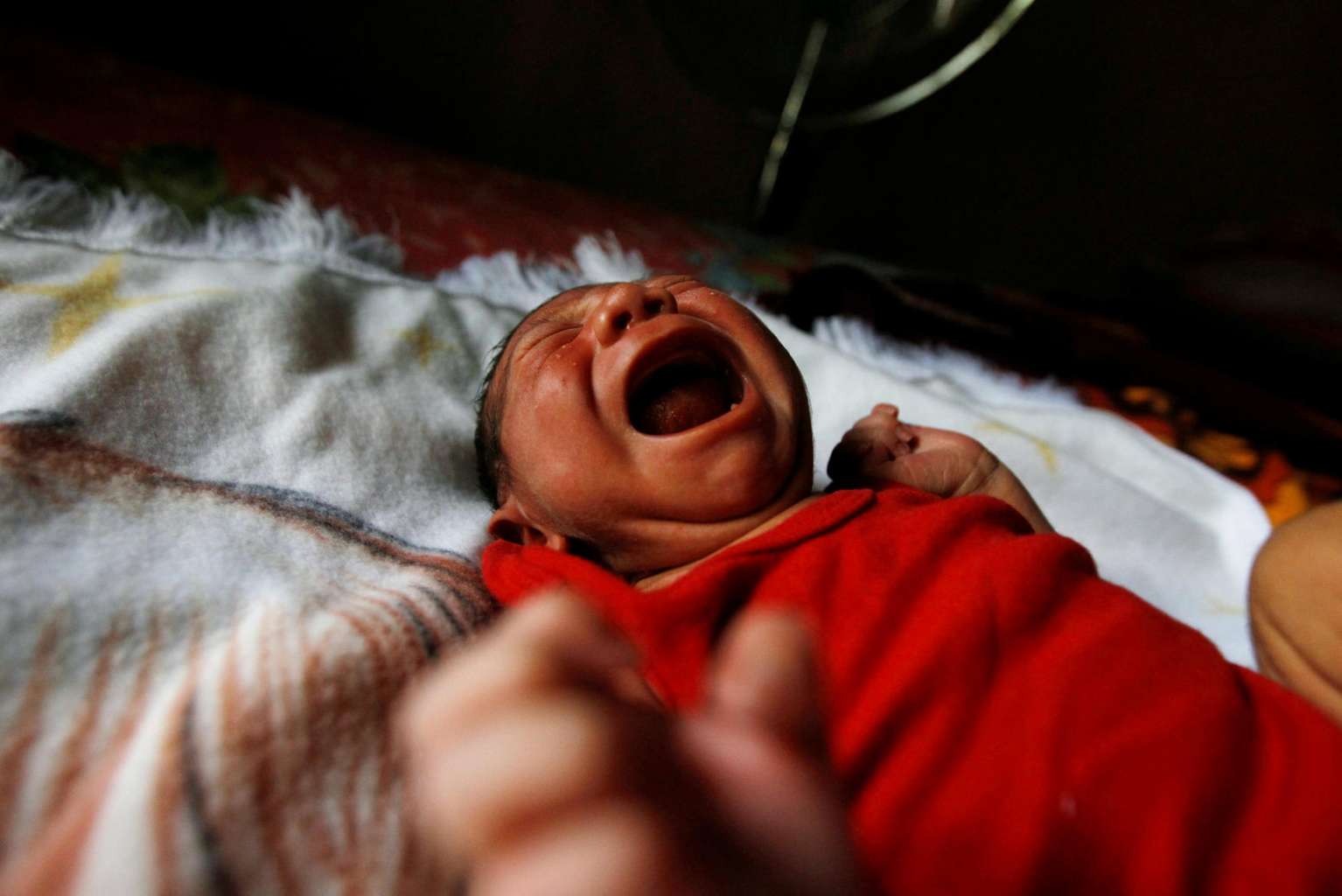 Eight-day old baby Allan, who was born with microcephaly, crying at home in Choluteca, Honduras, on July 29, 2016.