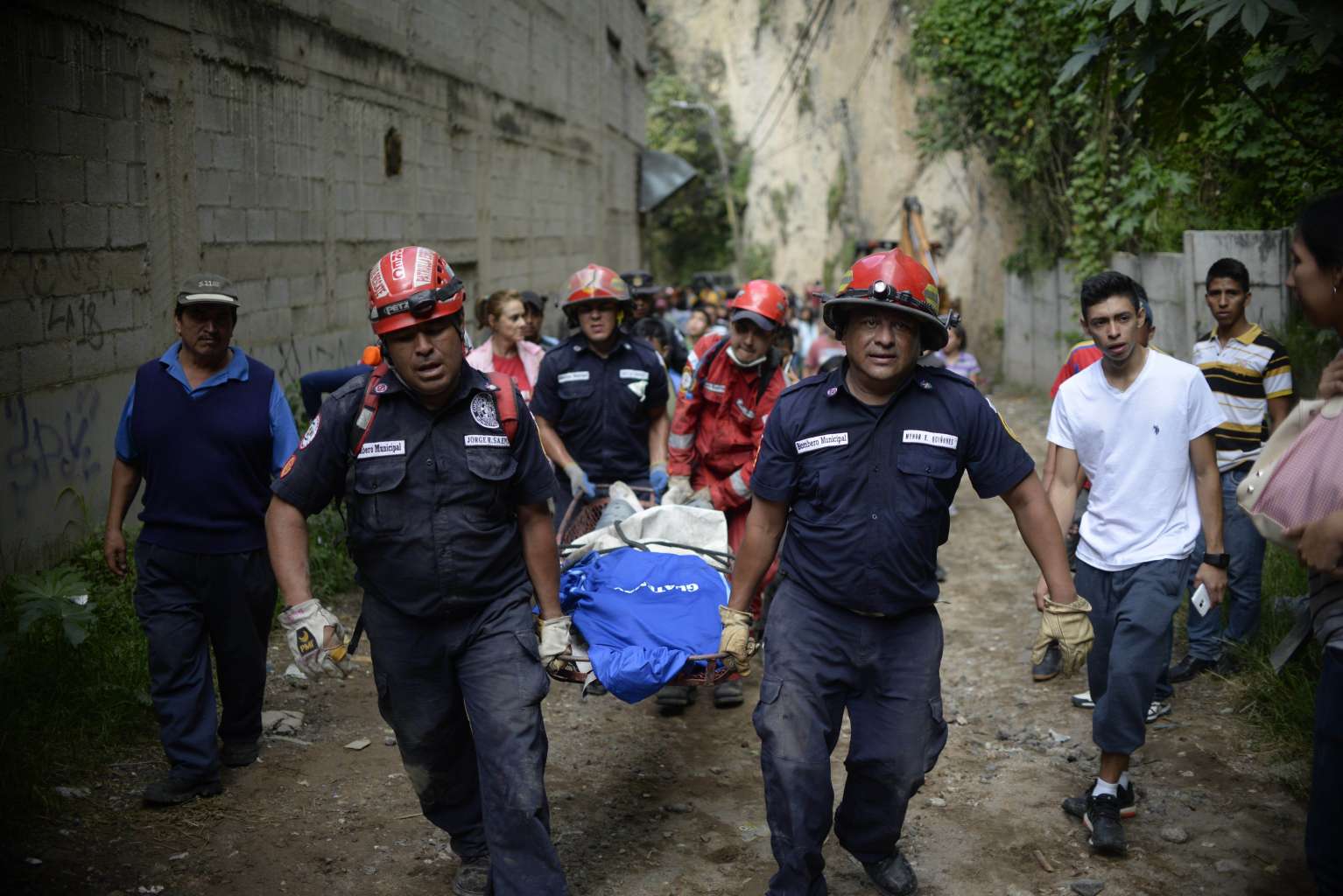 Rescuers carry a victim after a landslide at Cambray village, in Santa Catarina Pinula municipality.
