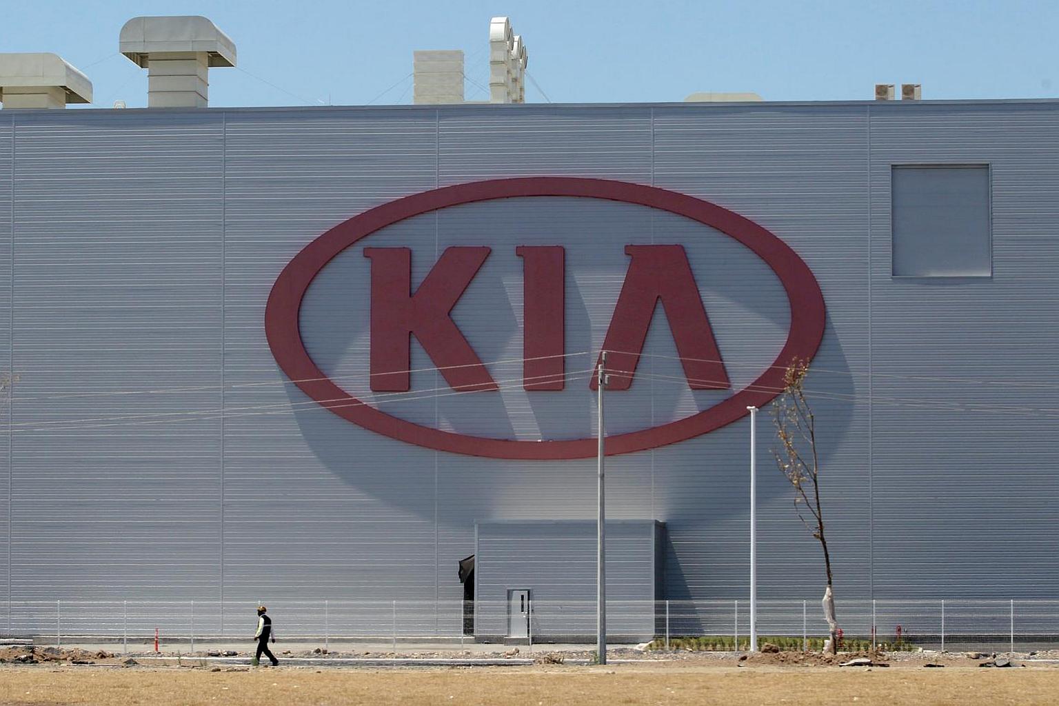 A man walks past the logo of Kia Motors at the manufacturing plant in Pesqueria, on the outskirts of Monterrey, Mexico.