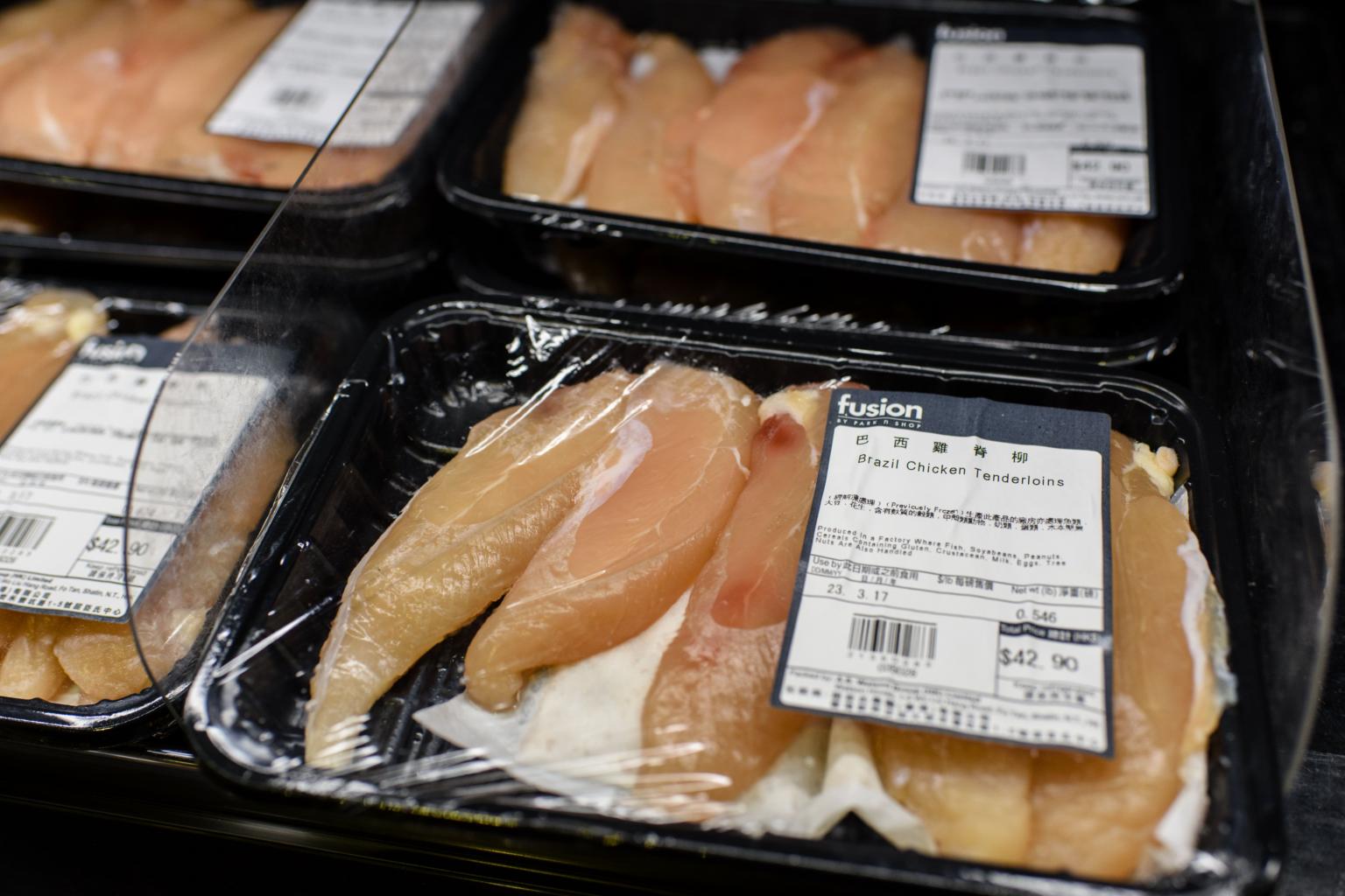 Packs of previously frozen Brazil chicken legs are seen stacked on a trolley shortly after a member of staff cleared them from the shelves of a supermarket in Hong Kong, on March 21, 2017.
