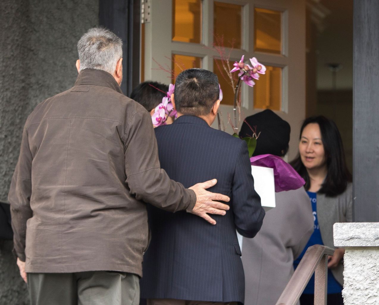 Meng Wanzhou (right) answers the door to individuals carrying flowers after she was released on bail.