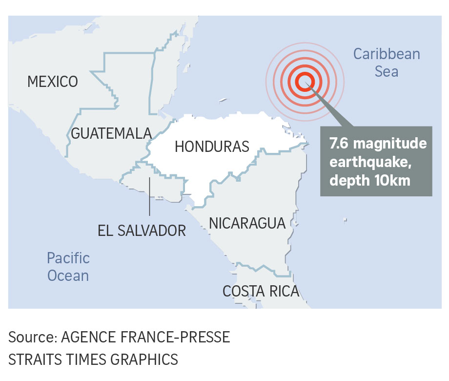TEGUCIGALPA (REUTERS) - An earthquake of magnitude 7.6 that struck near remote islands belonging to Honduras on Tuesday was felt across northern Central America but there were no immediate reports of casualties or major damage.