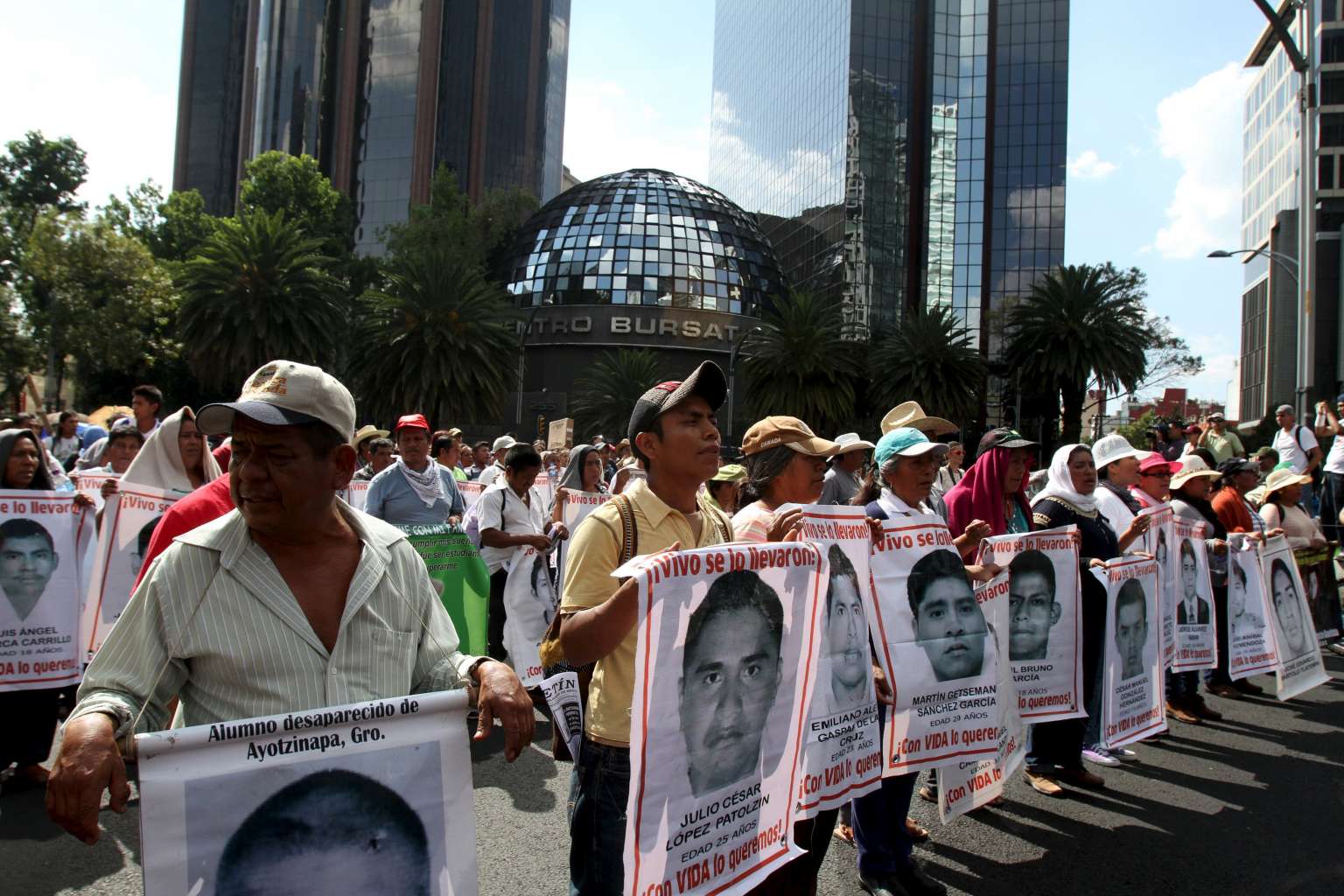 Relatives carry photos of some of the 43 missing students at a march in Mexico City.