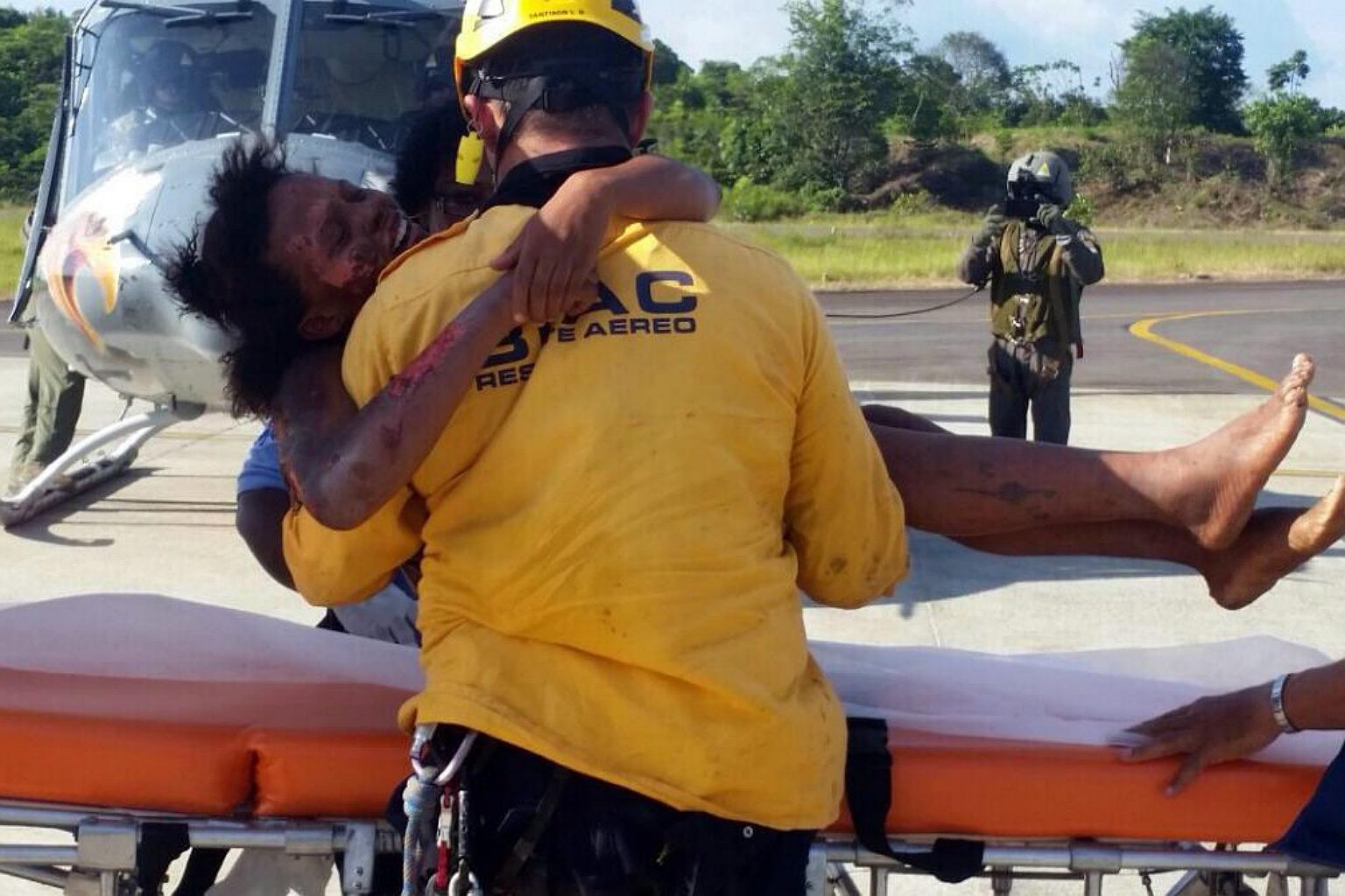 A rescue worker helping plane crash victim Nelly Murillo after her rescue in Quibdo, Colombia, on June 24, 2015.