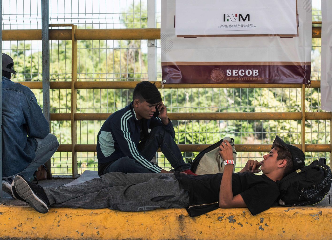An Honduran migrant heading to the US rests after receiving an identification bracelet from Mexican migration authorities.